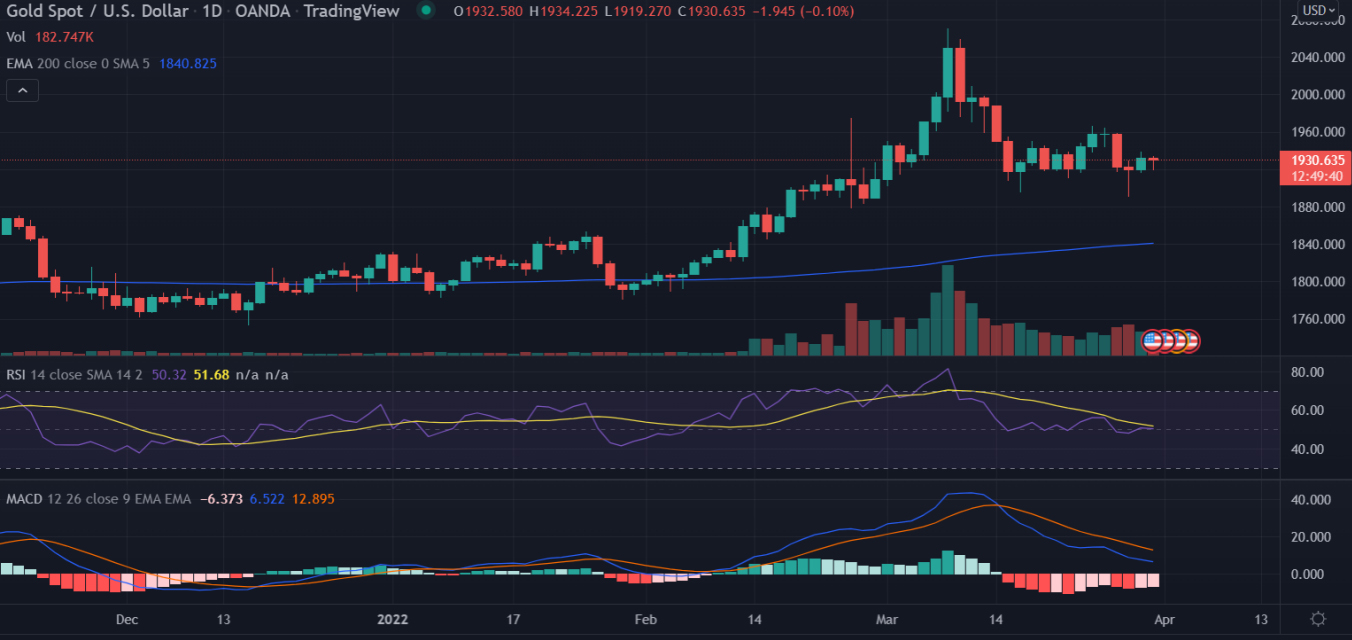 Currently, the precious metal consolidates near $1,920 after retracing from the all-time highs of $2,070.63. The yellow metal is considered a hedge against inflation and volatility. As Russia initiated the special military operation on February 24, the spot appreciated nearly 10% of the new highs made on March 8.